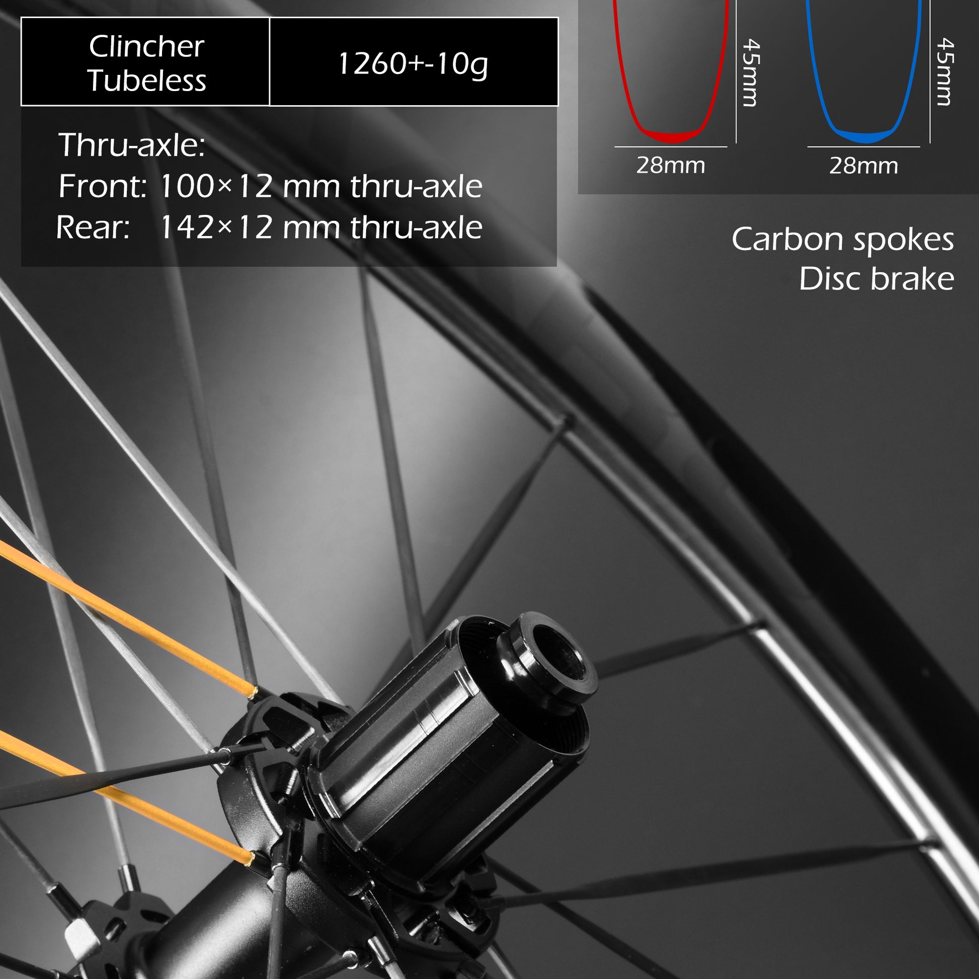 Carbon Fiber Road Bike Wheel Set 700C 45mm Disc Brake Thru-Axle, Carbon Fiber Blade Spokes(T-Head Design) Toray T700/T800 Hybrid, Clincher & Tubeless Support Tire Width 23-28mm