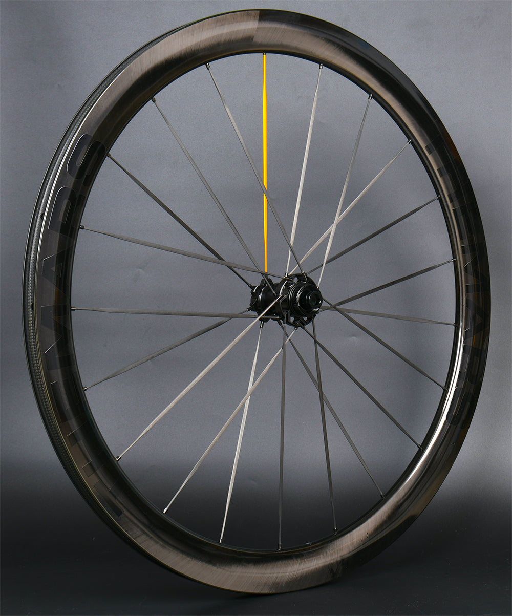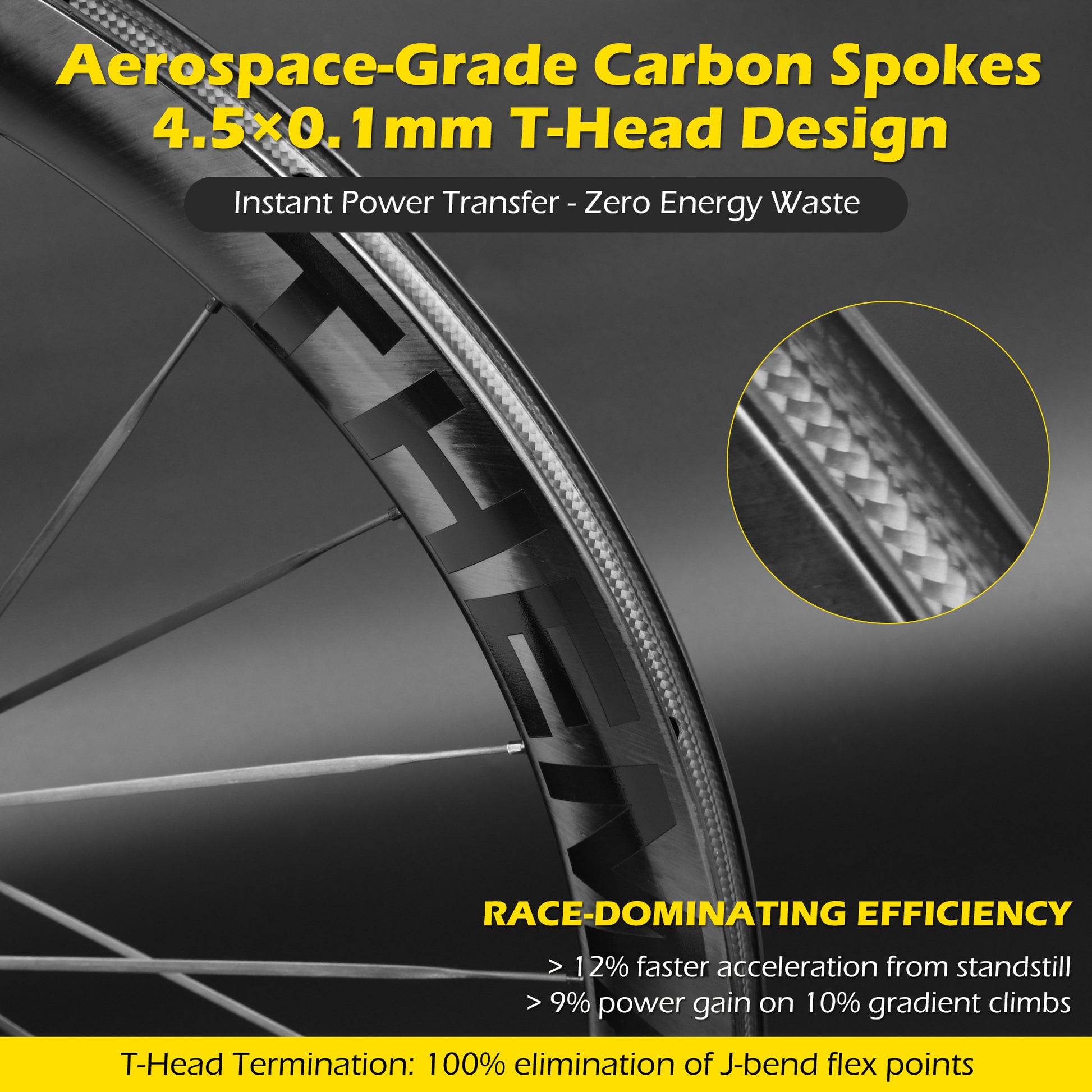 Carbon Fiber Blade Spokes: 4.5mm width, 0.2mm thickness, 3.3g weight, T-Head Termination: 100% elimination of J-bend flex points.